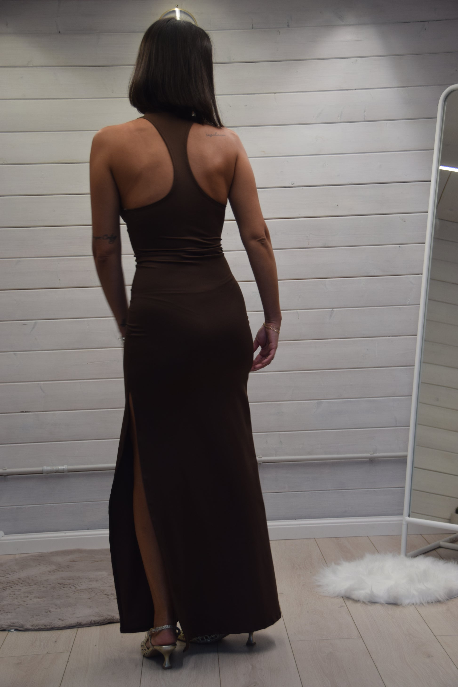 Elegante abito lungo senza maniche in tessuto fluido con collo alto drappeggiato e linea dritta per slanciare la figura